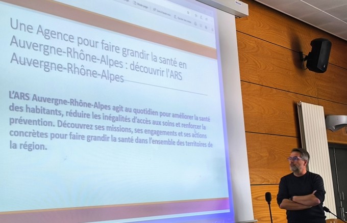 Monsieur Aubry a tout d’abord présenté l’ARS Auvergne-Rhône-Alpes, qui couvre l’une des plus vastes régions françaises avec plus de 8 millions d’habitants. Il a rappelé que l’agence est un acteur public central, placé sous la tutelle du ministère de la Santé, et qu’elle travaille en étroite collaboration avec de nombreux partenaires : professionnels de santé, établissements hospitaliers, collectivités territoriales, associations et organismes de protection sociale.